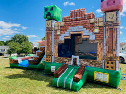 Bring your child's favorite video game to life with our Bounce N Craft Combo! This show-stopping inflatable features a pixelated castle design topped with some familiar characters, making it the ultimate party attraction for gamers of all ages. With a spacious bouncing area, climbing wall, and a double lane slide for fun races, it's the perfect bounce house for all celebrations! Turn your backyard into a pixel-powered playground with our Bounce N Craft Combo!